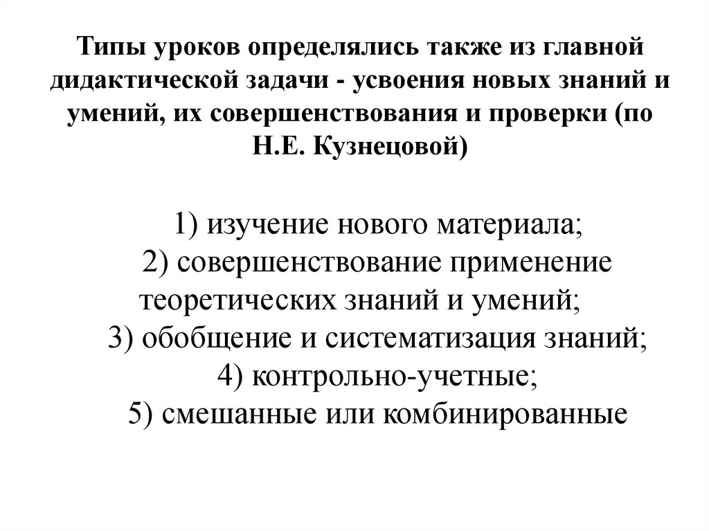 Типы уроков определялись также из главнойдидактической задачи - усвоения новых знаний и