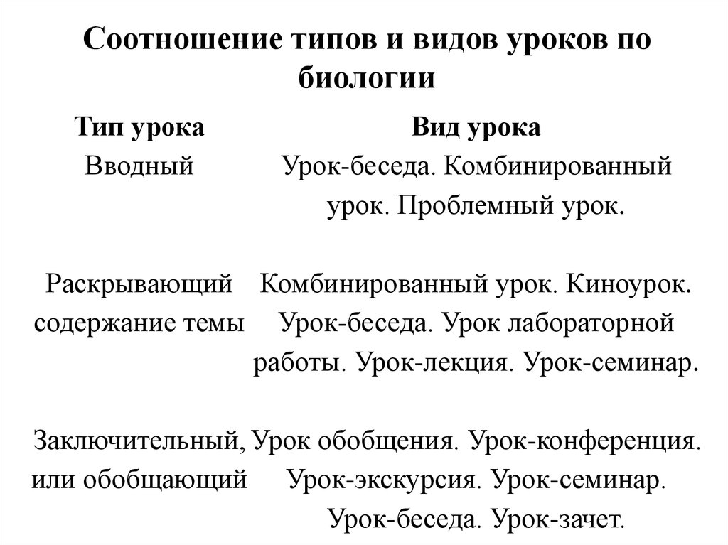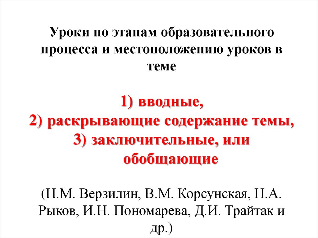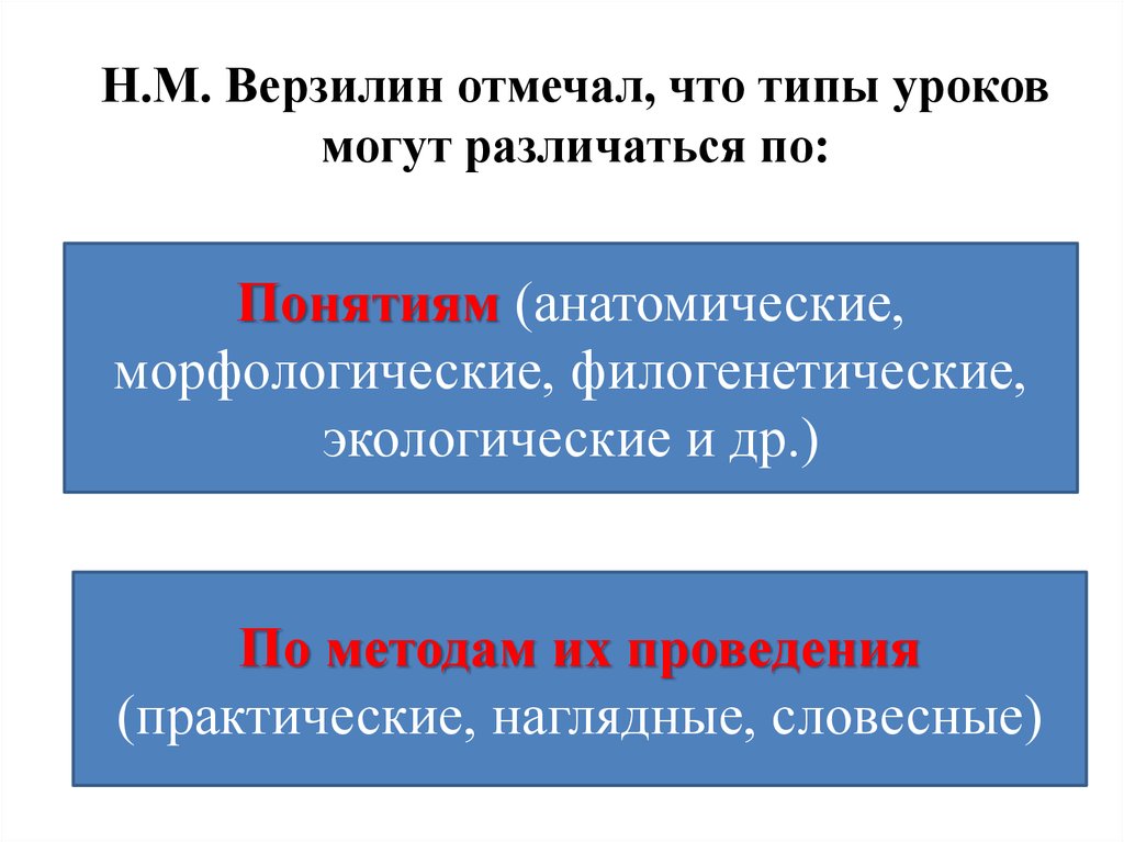 Н.М. Верзилин отмечал, что типы уроковмогут различаться по: