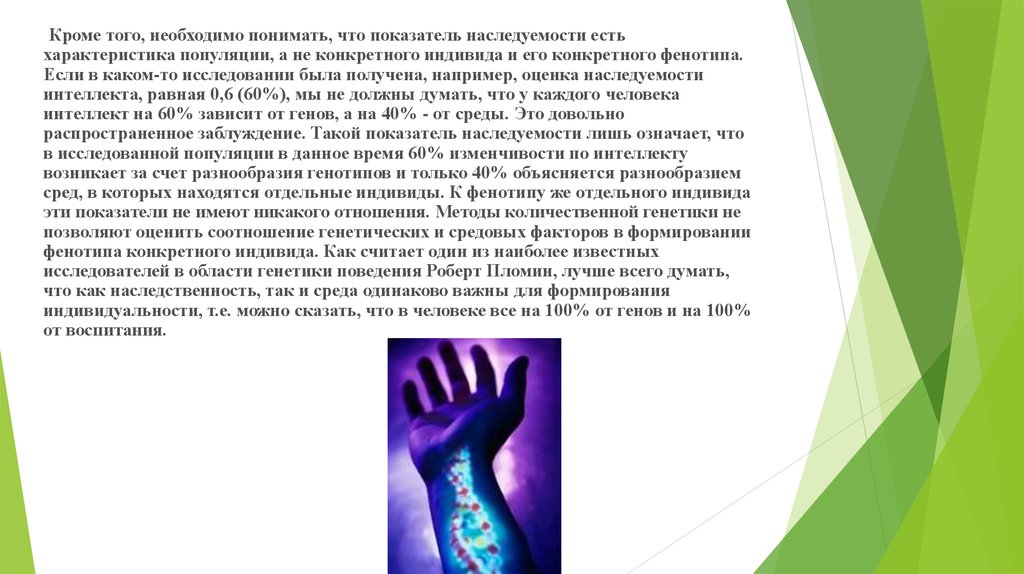 Кроме того, необходимо понимать, что показатель наследуемости естьхарактеристика популяции, а не конкретного индивида и его конкретного фенотипа.