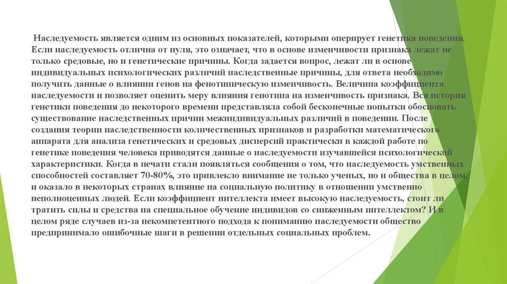 Наследуемость является одним из основных показателей, которыми оперирует генетика поведения.Если наследуемость отлична от нуля, это означает, что в основе изменчивости признака лежат не
