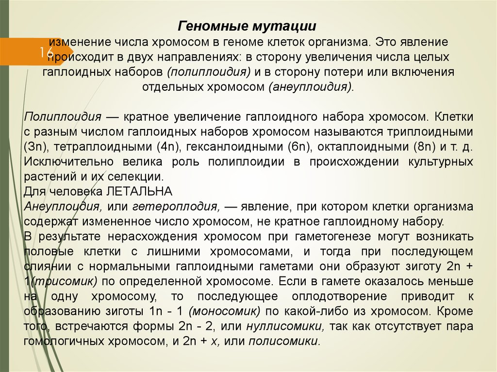 Геномные мутацииизменение числа хромосом в геноме клеток организма. Это явление