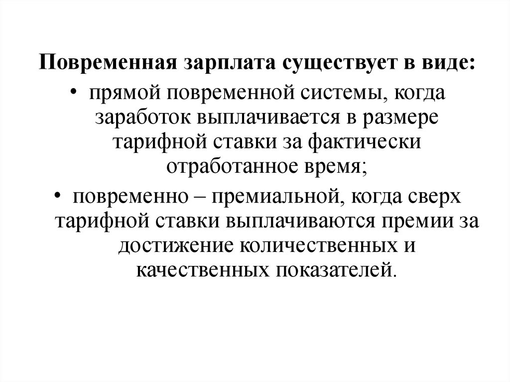 Повременная зарплата существует в виде:• прямой повременной системы, когда