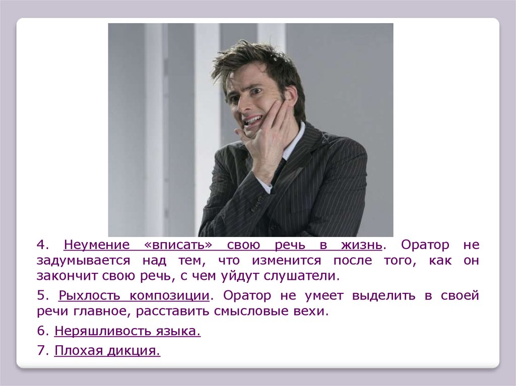 4. Неумение «вписать» свою речь в жизнь. Оратор незадумывается над тем, что изменится после того, как он