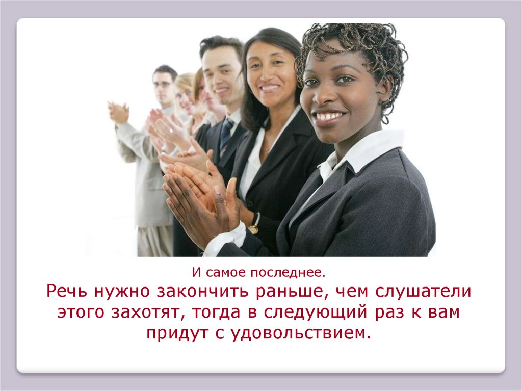 И самое последнее.Речь нужно закончить раньше, чем слушатели
