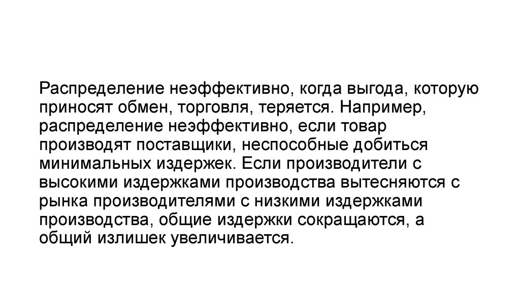 Распределение неэффективно, когда выгода, которуюприносят обмен, торговля, теряется. Например,