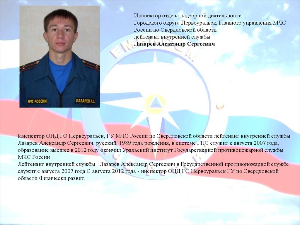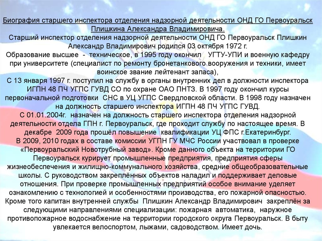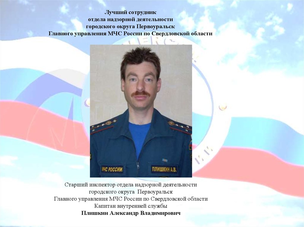 Биография старшего инспектора отделения надзорной деятельности ОНД ГО ПервоуральскПлишкина Александра Владимировича.