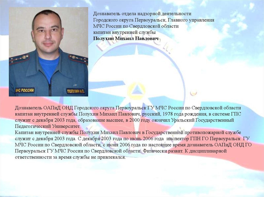 капитан внутренней службы Полухин Михаил Павлович, русский, 1978 года рождения, в системе ГПС
