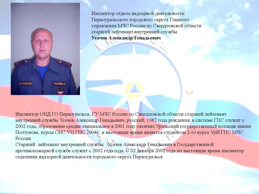 внутренней службы Усачев Александр Генадьевич, русский, 1982 года рождения, в системе ГПС служит с