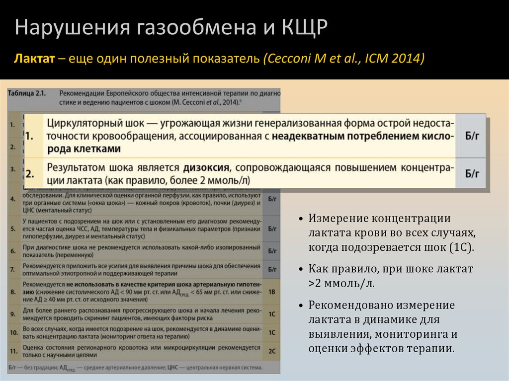 Нарушения газообмена и КЩРЛактат – еще один полезный показатель (Cecconi M et al., ICM 2014)