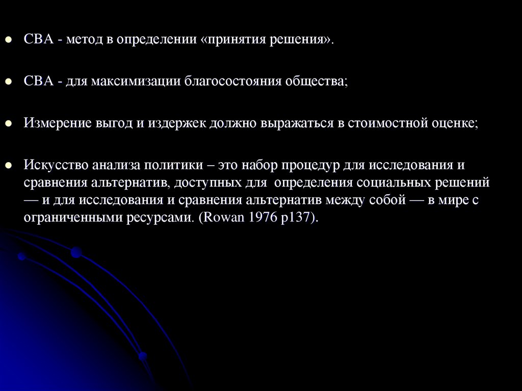 CBA - метод в определении «принятия решения».CBA - для максимизации благосостояния общества;