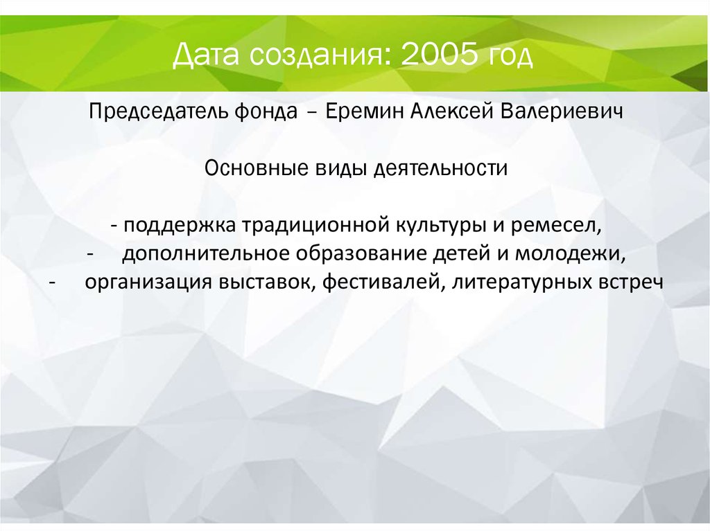 Дата создания: 2005 годПредседатель фонда – Еремин Алексей Валериевич