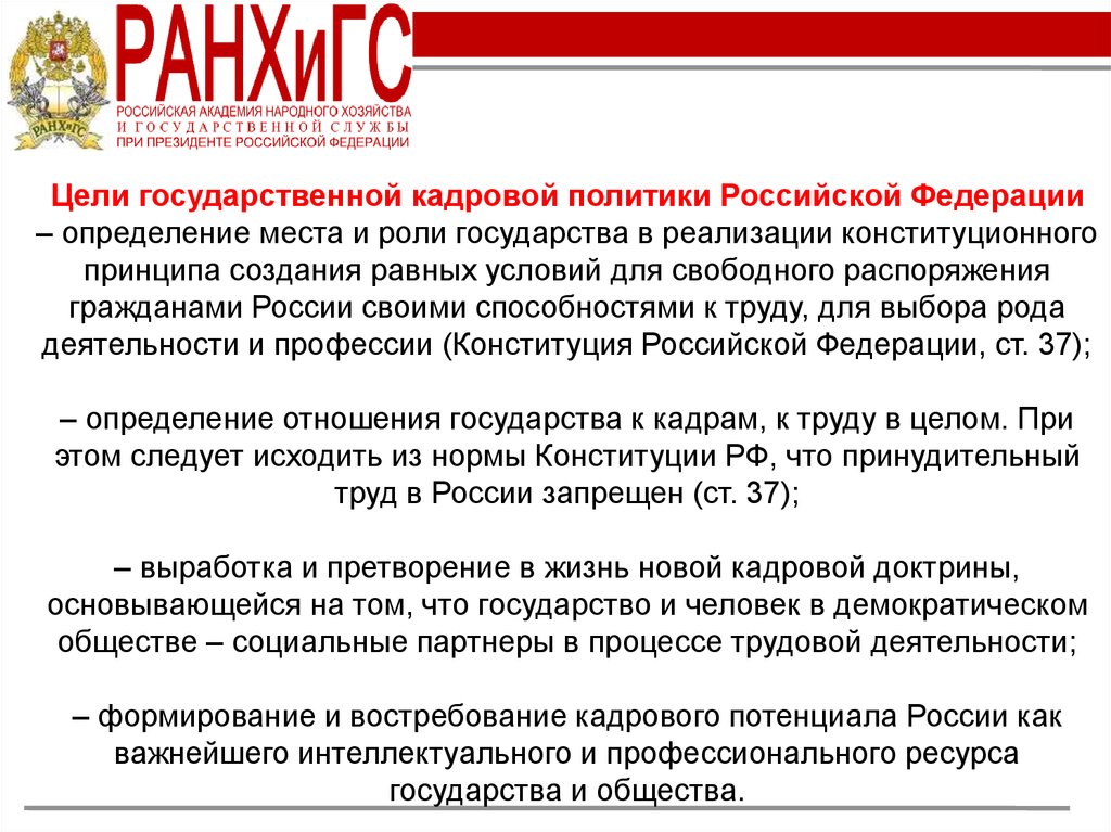 Цели государственной кадровой политики Российской Федерации– определение места и роли государства в реализации конституционного