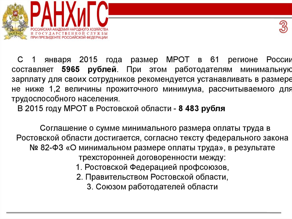 С 1 января 2015 года размер МРОТ в 61 регионе Россиисоставляет 5965 рублей. При этом работодателям минимальную