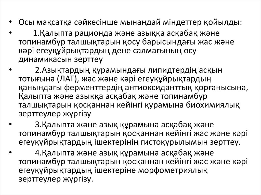 • Осы мақсатқа сәйкесінше мынандай міндеттер қойылды:1.Қалыпта рационда және азыққа асқабақ және