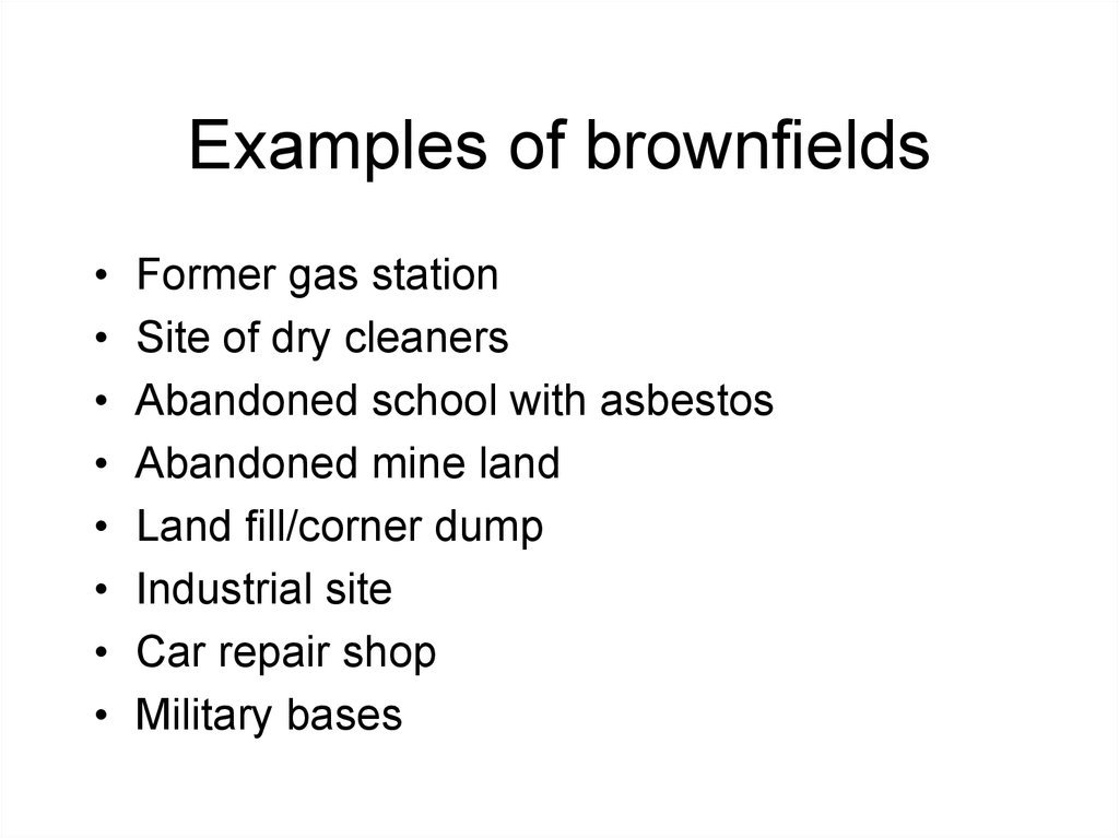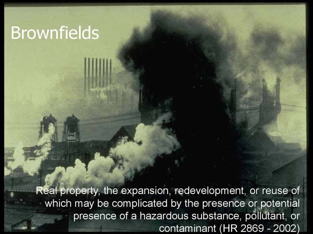 BrownfieldsReal property, the expansion, redevelopment, or reuse of