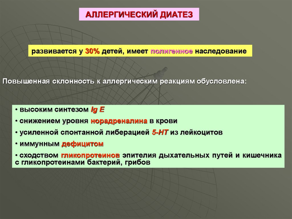 АЛЛЕРГИЧЕСКИЙ ДИАТЕЗразвивается у 30% детей, имеет полигенное наследование