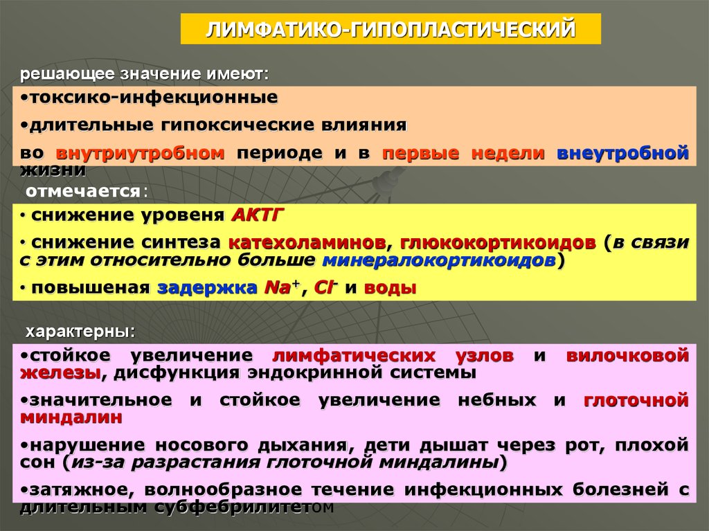 ЛИМФАТИКО-ГИПОПЛАСТИЧЕСКИЙрешающее значение имеют: