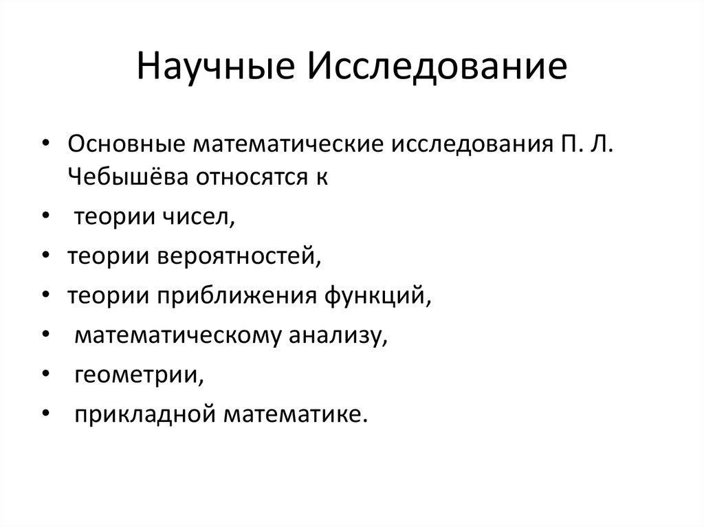 • Основные математические исследования П. Л.Чебышёва относятся к