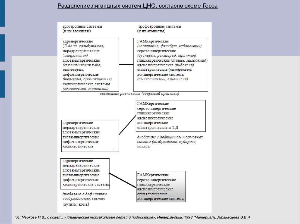 Разделение лигандных систем ЦНС, согласно схеме Гесса(из: Маркова И.В., с соавт., «Клиническая токсикология детей и подростков», Интермедика, 1998 (Материалы Афанасьева В.В.))