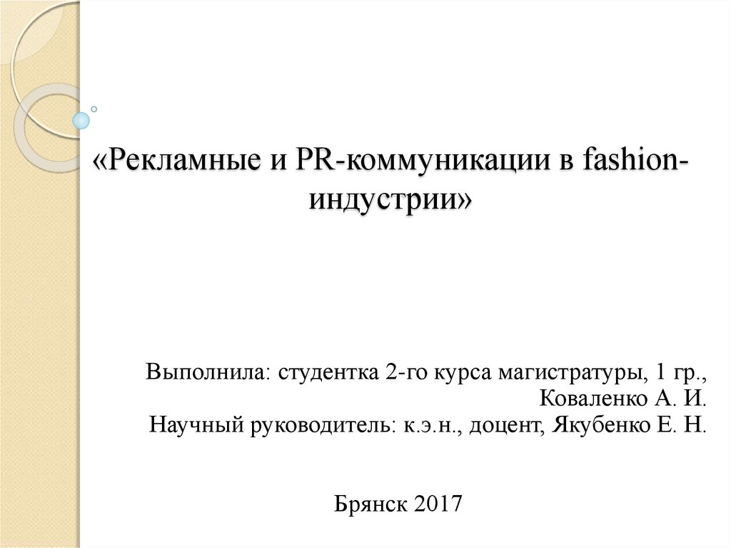 «Рекламные и PR-коммуникации в fashionиндустрии»Выполнила: студентка 2-го курса магистратуры, 1 гр.,
