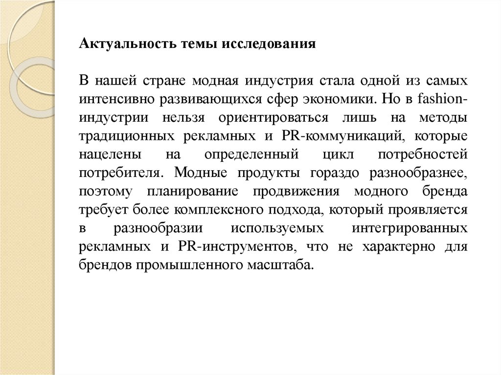Актуальность темы исследованияВ нашей стране модная индустрия стала одной из самых