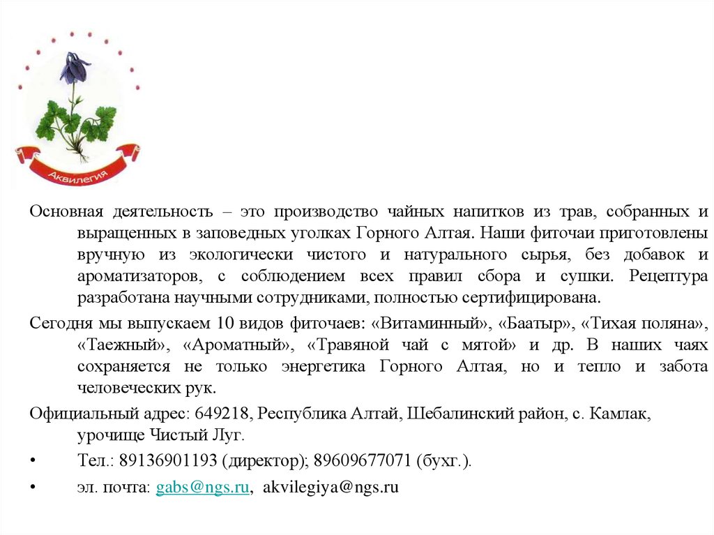 Основная деятельность – это производство чайных напитков из трав, собранных ивыращенных в заповедных уголках Горного Алтая. Наши фиточаи приготовлены