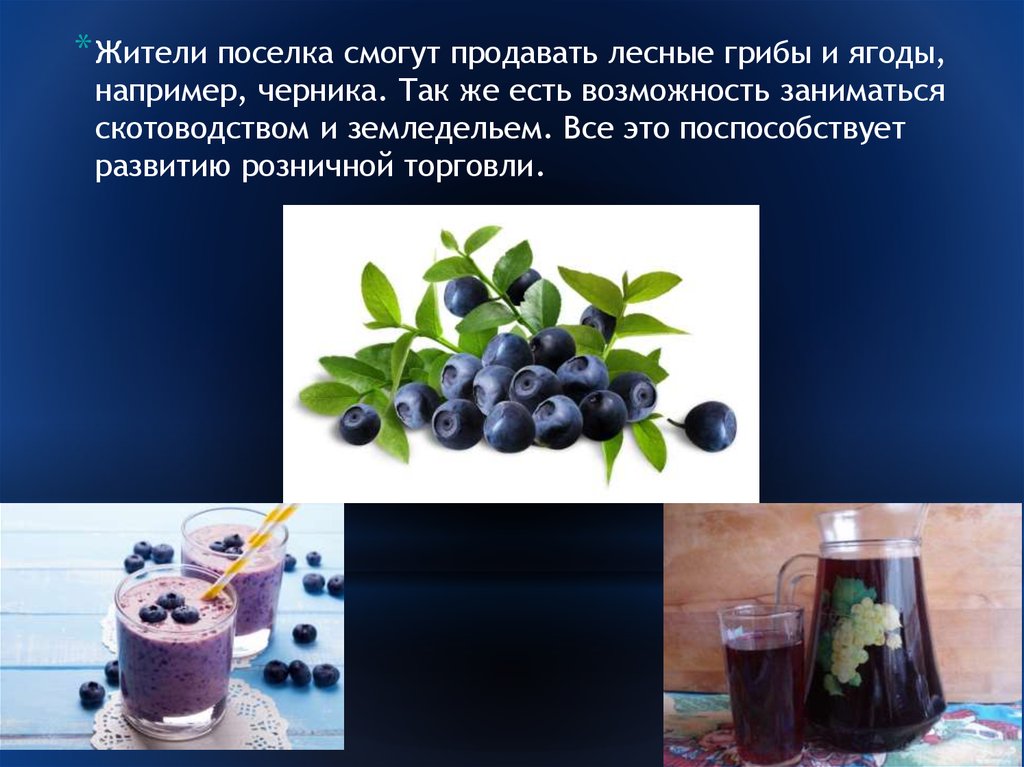 * Жители поселка смогут продавать лесные грибы и ягоды,например, черника. Так же есть возможность заниматься