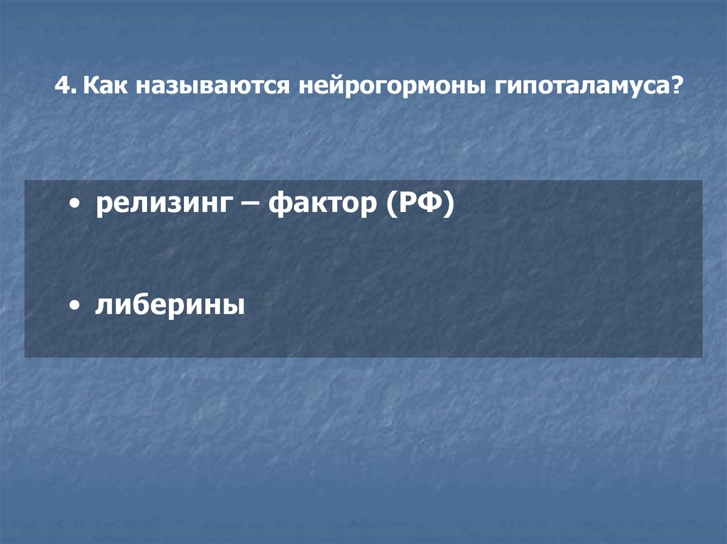 4. Как называются нейрогормоны гипоталамуса?• релизинг – фактор (РФ)