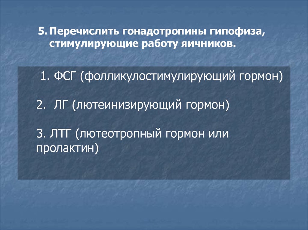 5. Перечислить гонадотропины гипофиза,стимулирующие работу яичников.