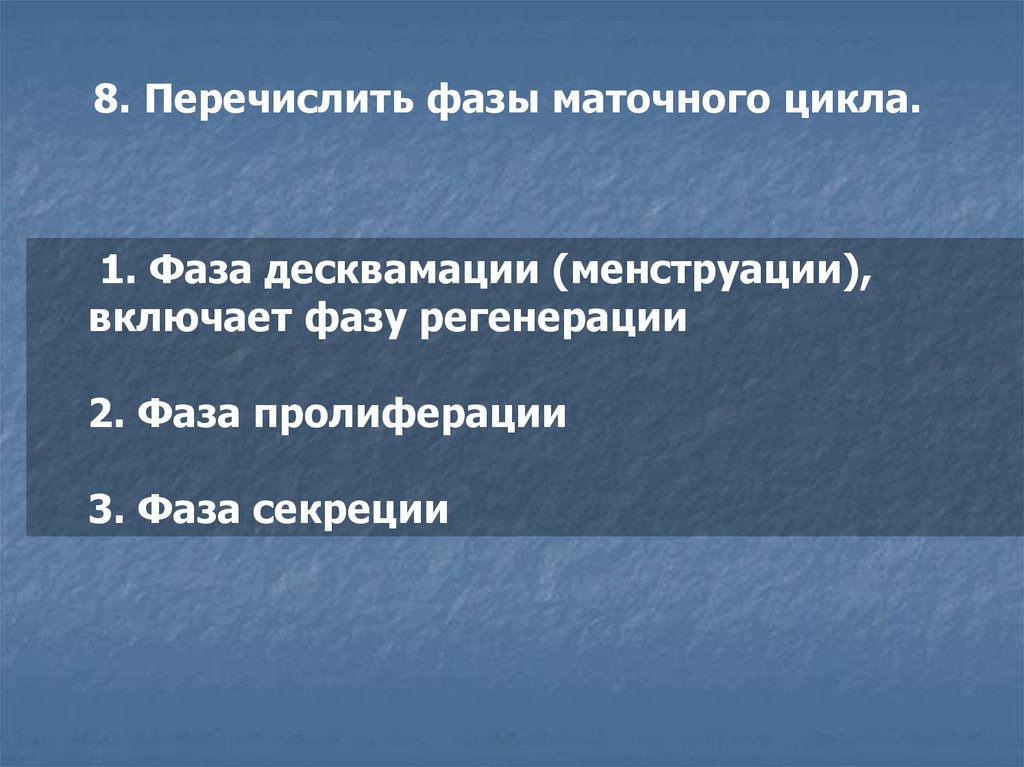 8. Перечислить фазы маточного цикла.1. Фаза десквамации (менструации),