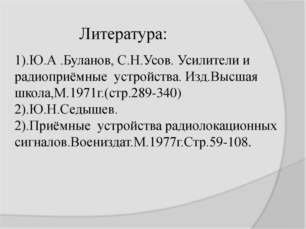 Литература:1).Ю.А .Буланов, С.Н.Усов. Усилители и