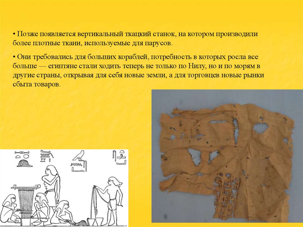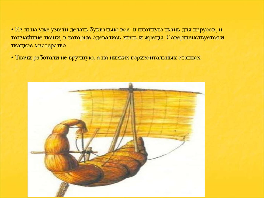 • Из льна уже умели делать буквально все: и плотную ткань для парусов, итончайшие ткани, в которые одевались знать и жрецы. Совершенствуется и
