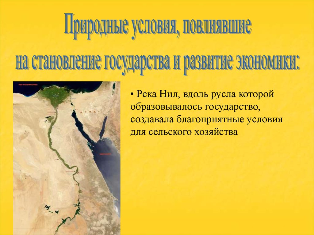 • Река Нил, вдоль русла которойобразовывалось государство,