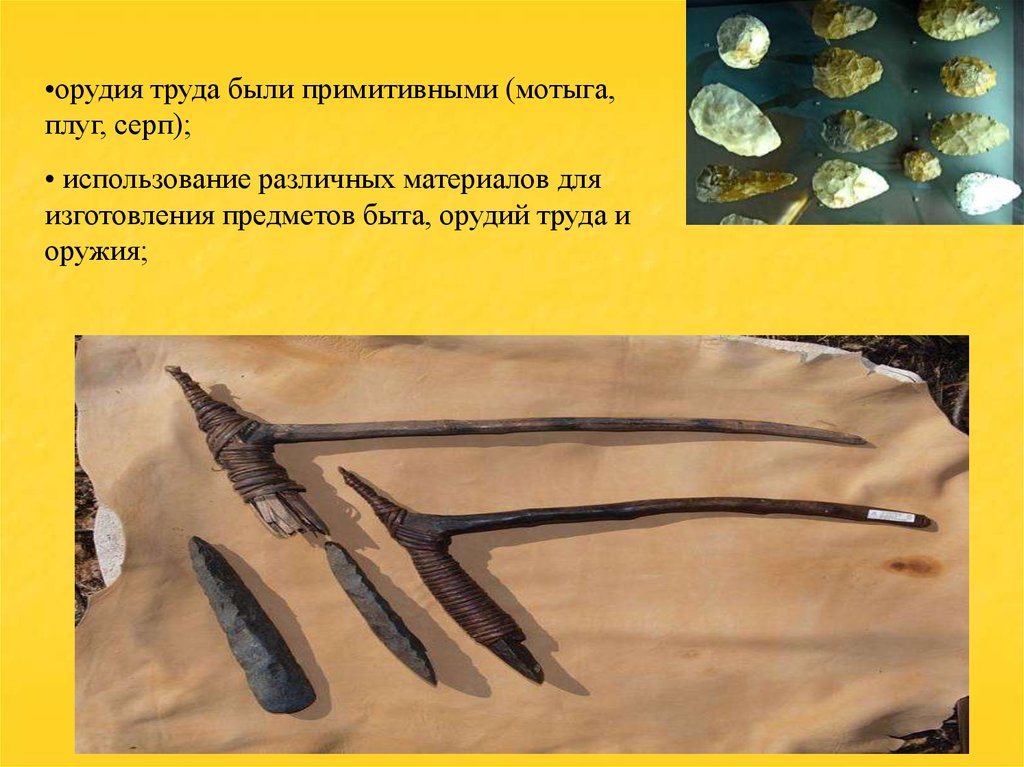 •орудия труда были примитивными (мотыга,плуг, серп);