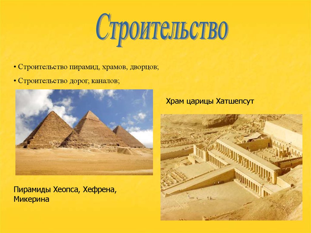 • Строительство пирамид, храмов, дворцов;• Строительство дорог, каналов;