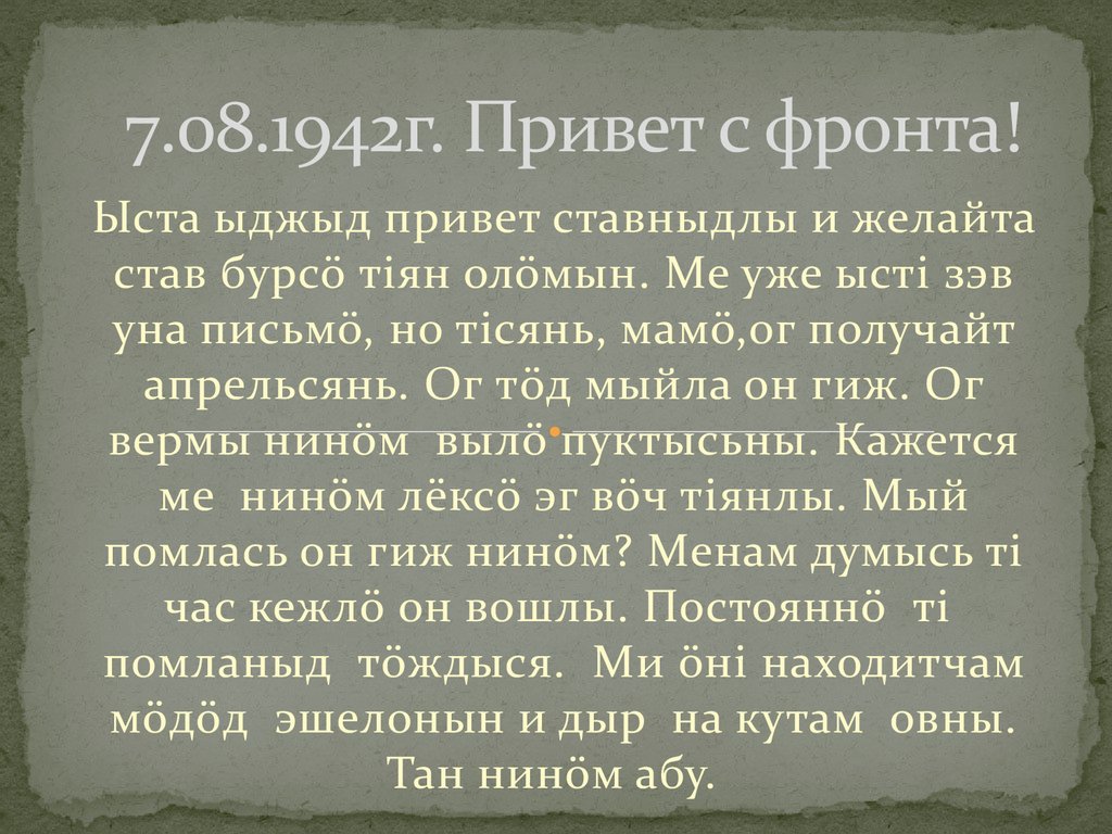 письмö. Висьтав привет мамнумлы Ольга Герасимовналы, чойвокыдлы, Кирö чойяслы и челядьыслы, тьöтъяслы и дядьяслы.
