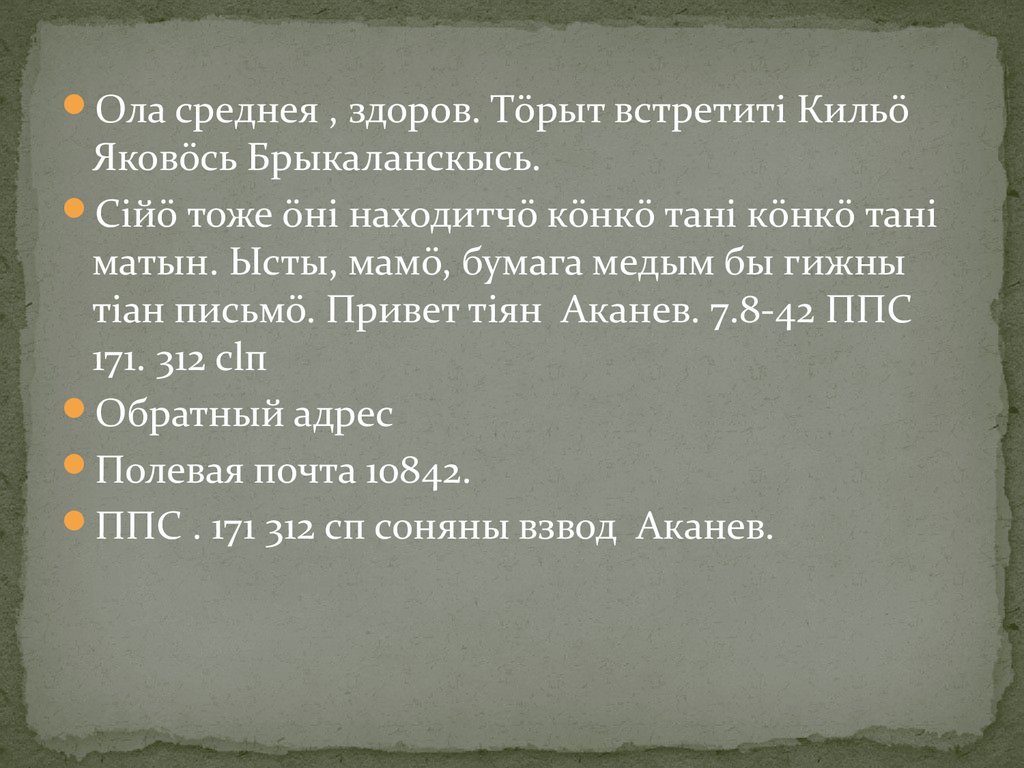 тiан письмö. Привет тiян Аканев. 7.8-42 ППС