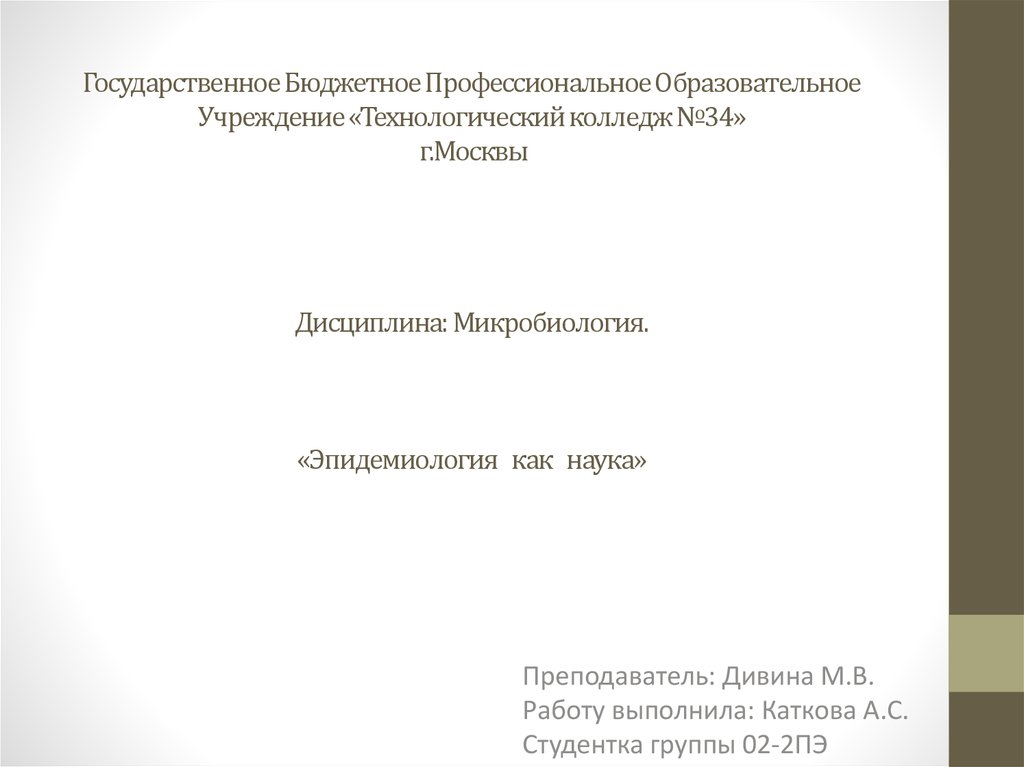 1. Государственное Бюджетное Профессиональное Образовательное Учреждение «Технологический колледж №34» г.Москвы Дисциплина: Микробиология