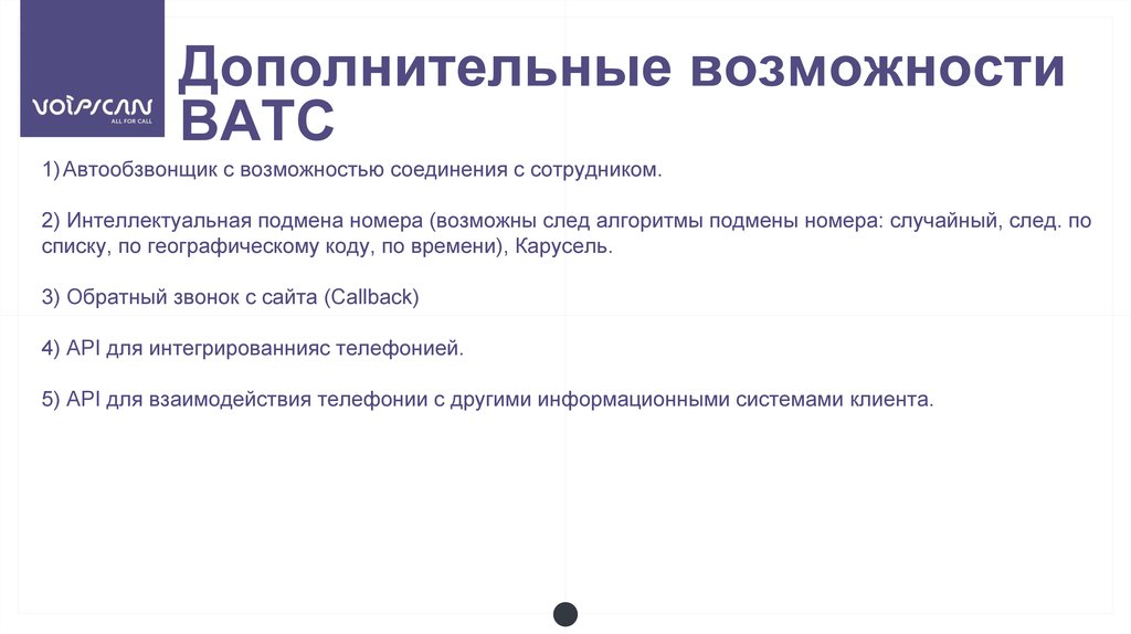 5) API для взаимодействия телефонии с другими информационными системами клиента.