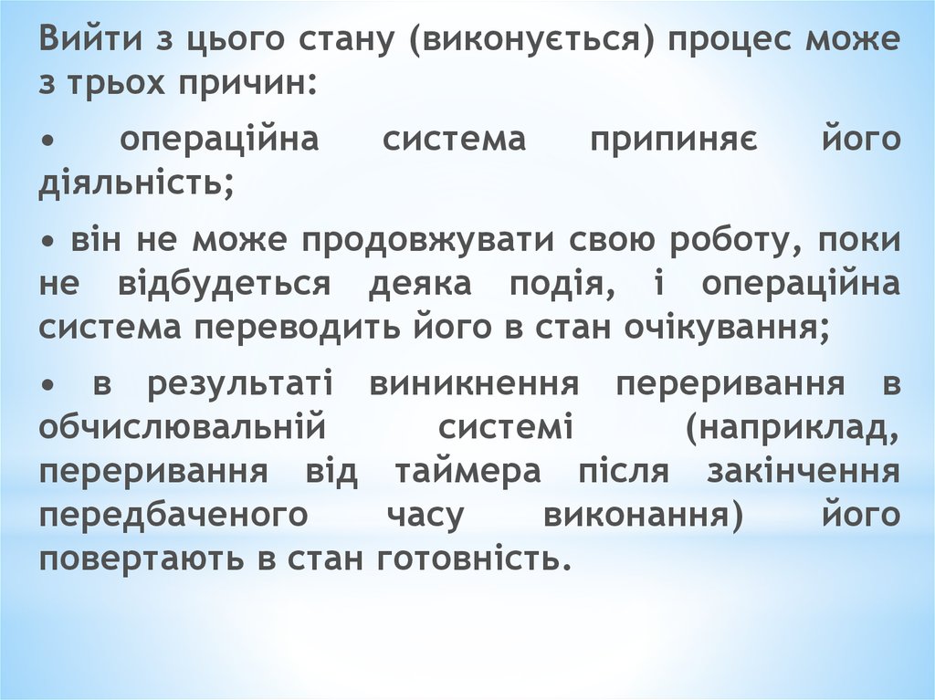 Вийти з цього стану (виконується) процес можез трьох причин: