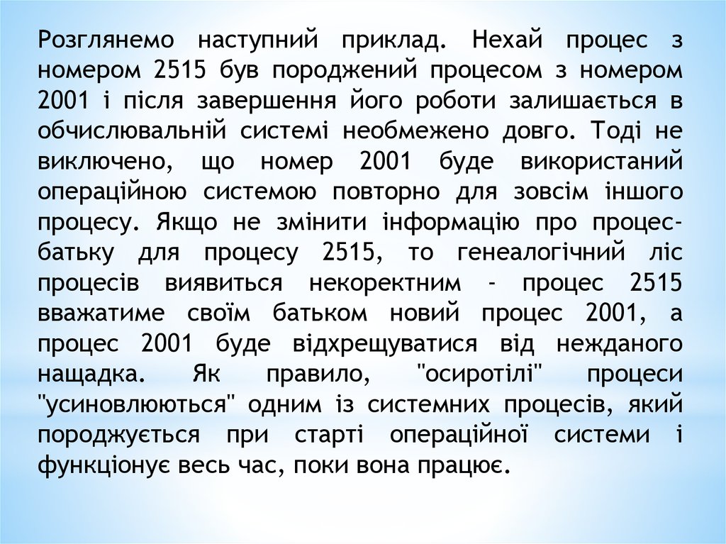 Розглянемо наступний приклад. Нехай процес зномером 2515 був породжений процесом з номером