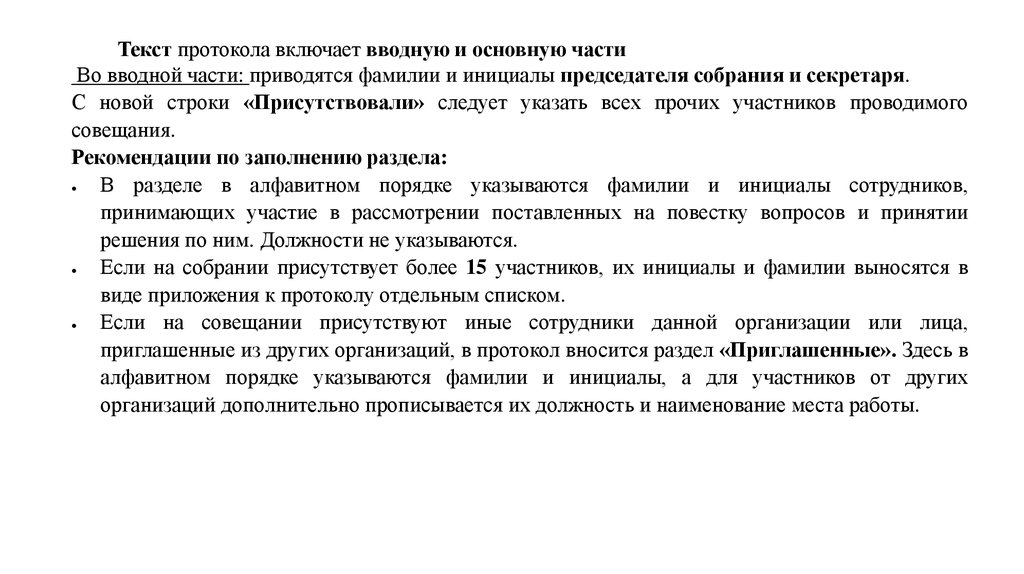 Текст протокола включает вводную и основную частиВо вводной части: приводятся фамилии и инициалы председателя собрания и секретаря.