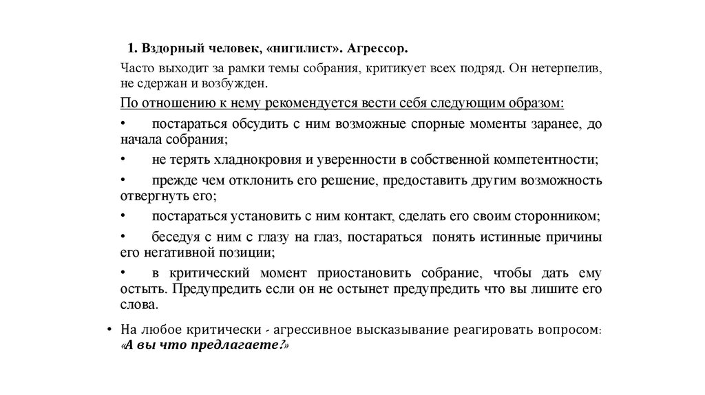 1. Вздорный человек, «нигилист». Агрессор.Часто выходит за рамки темы собрания, критикует всех подряд. Он нетерпелив,