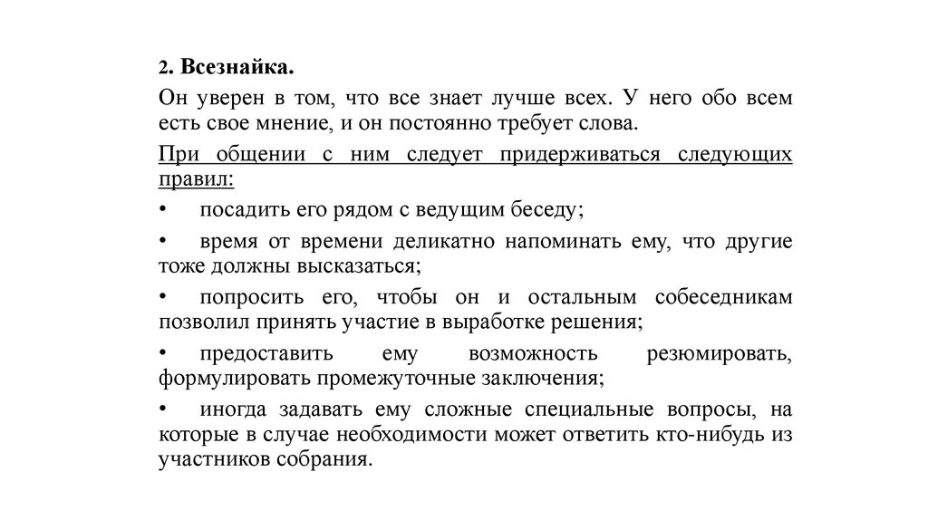 2. Всезнайка.Он уверен в том, что все знает лучше всех. У него обо всем