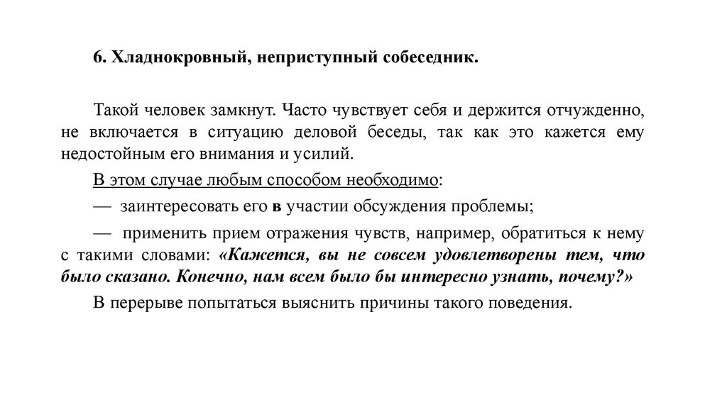 6. Хладнокровный, неприступный собеседник.Такой человек замкнут. Часто чувствует себя и держится отчужденно,