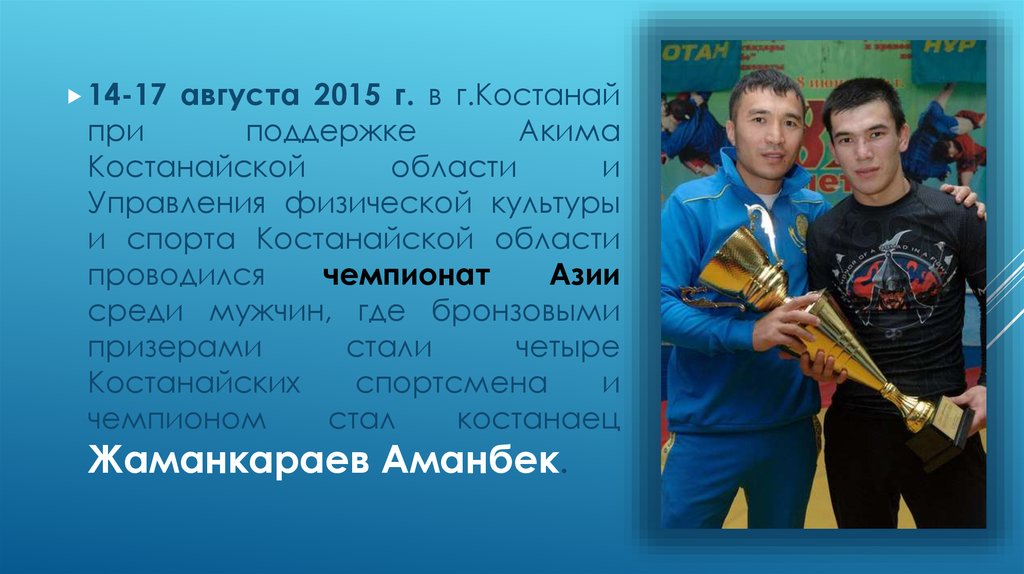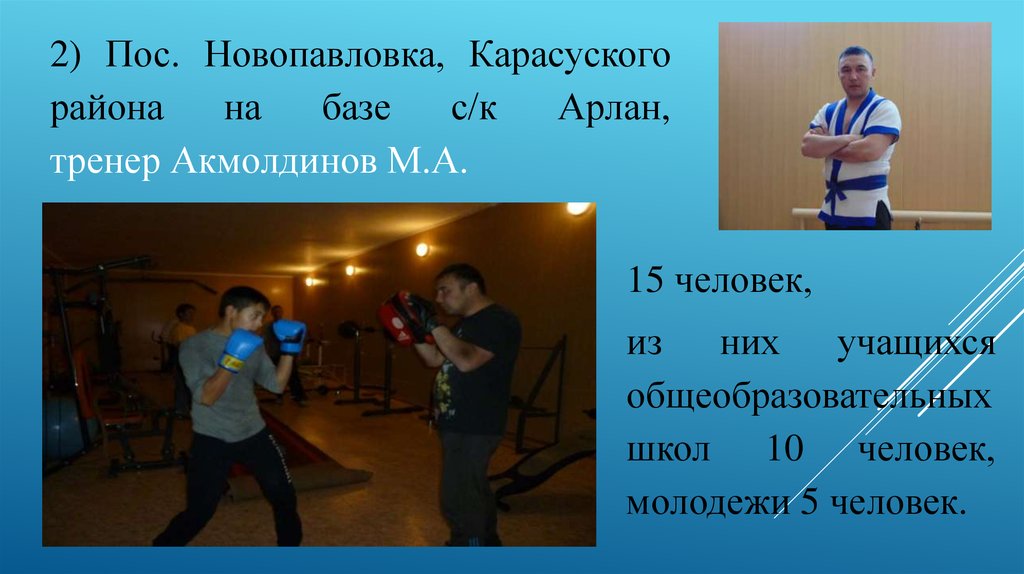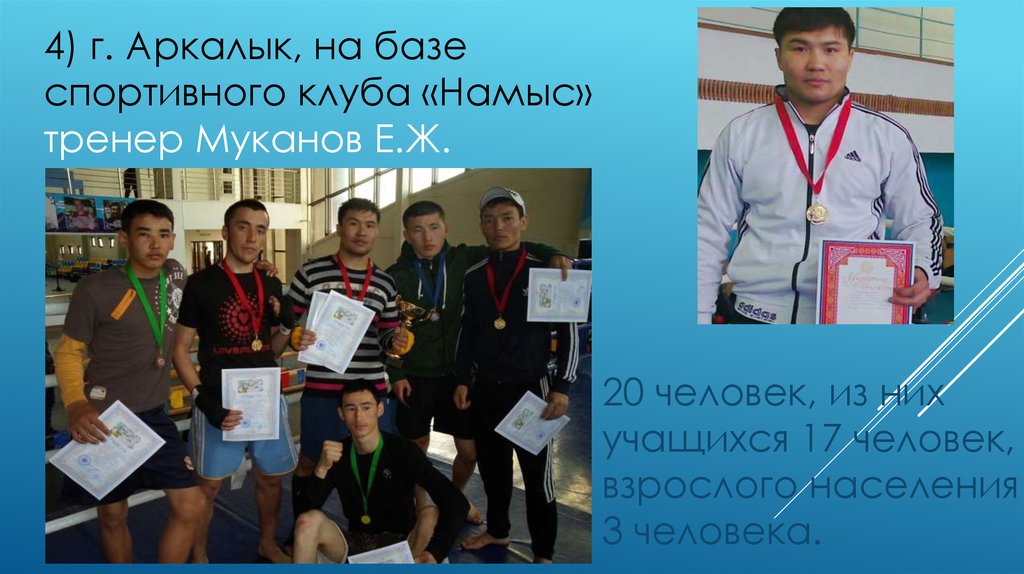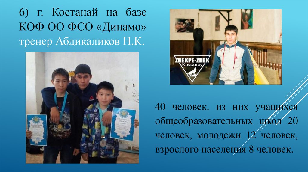 1)г. Костанай на базе Костанайского политехнического колледжатренер Алиев Р.М.