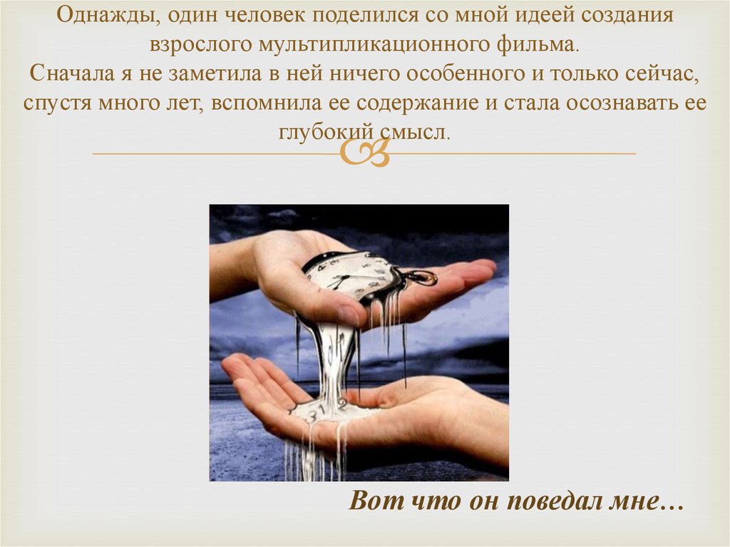 1. Однажды, один человек поделился со мной идеей создания взрослого мультипликационного фильма. Сначала я не заметила в ней ничего особенног