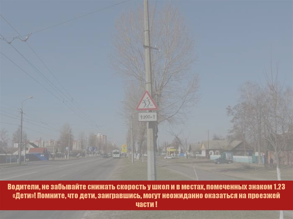 Водители, не забывайте снижать скорость у школ и в местах, помеченных знаком 1.23«Дети»! Помните, что дети, заигравшись, могут неожиданно оказаться на проезжей