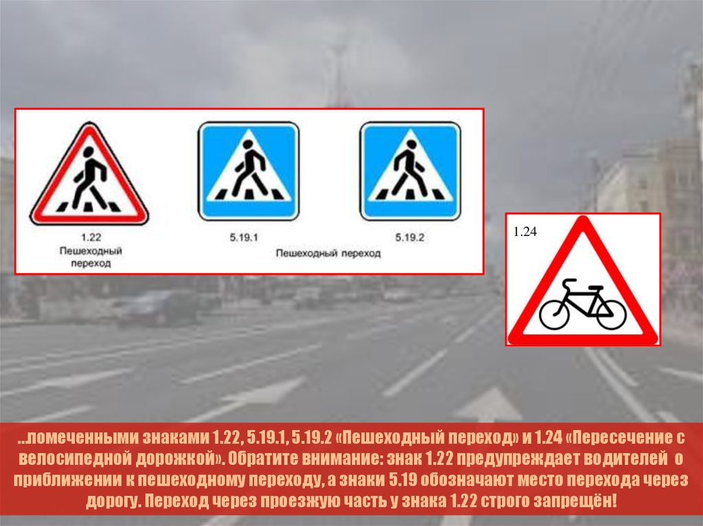 1.24…помеченными знаками 1.22, 5.19.1, 5.19.2 «Пешеходный переход» и 1.24 «Пересечение с