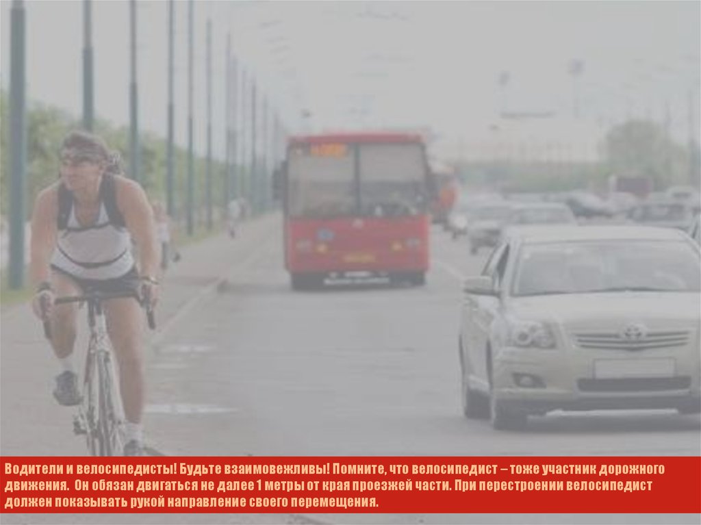 Водители и велосипедисты! Будьте взаимовежливы! Помните, что велосипедист – тоже участник дорожногодвижения. Он обязан двигаться не далее 1 метры от края проезжей части. При перестроении велосипедист